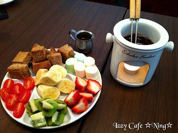 一推開Izzycafe的門撲鼻而來的是陣陣咖啡香及烤餅乾的香氣~下午茶時段點了60%人氣黑巧克力鍋~另外選項還有71%較苦黑巧克力鍋~也有33%白巧克力鍋和牛奶起司鍋~採用比利時和法國進口的巧克力鍋好香好濃喔~滿滿的幸福感~再搭配麵包磚+棉花糖+水果拼盤:番茄/奇異果/香蕉/草莓多麼豐盛呀~我覺得麵包磚和香蕉與巧克力最為match~旁邊那小杯內是黑咖啡~用來稀釋巧克力避免加熱過濃底部產生燒焦~這咖啡會回甘呢!