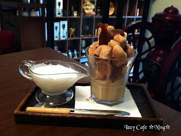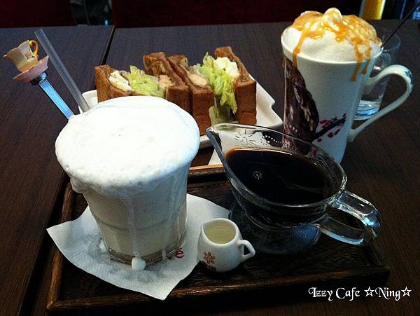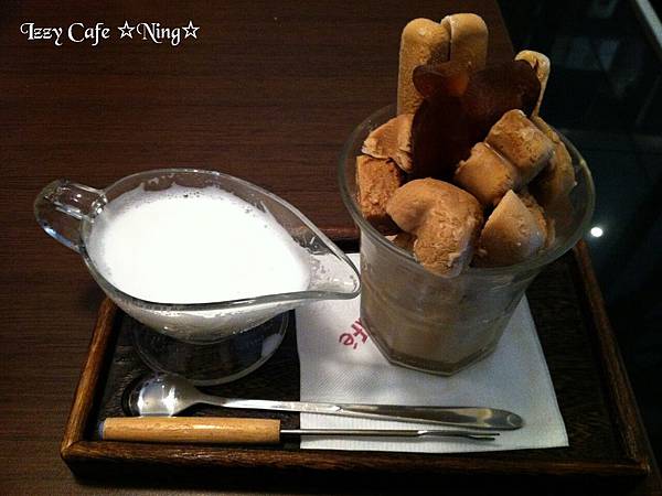 Izzycafe除了巧克力和手工餅是一大賣點~自己烘培的咖啡也非常好喝~我點了造型非常特別搶眼的冰磚冰咖啡~滿滿各式造型的咖啡冰磚~是用黑咖啡拿鐵咖啡卡布直接下去製作的冰磚~旁邊是香醇的溫牛奶~沖入杯中讓冰磚慢慢融化~喝起來也有不同層次感~融化後更香濃~旁邊小叉子可是用來鑿冰~也可以把泡過牛奶的咖啡冰磚叉起來含~這滿滿愛心造型小魚造型棒棒型的冰磚咖啡好喝又有趣