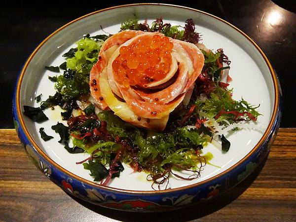 海藻玫瑰生魚片:一上桌就很吸睛,是不是很美?不只好看還很好吃!口感非常好又營養的海藻搭上和風醋非常清爽美味,生魚片上還有我最愛那啵啵的鮭魚卵,生魚片新鮮又大片,我的必點口袋名單。