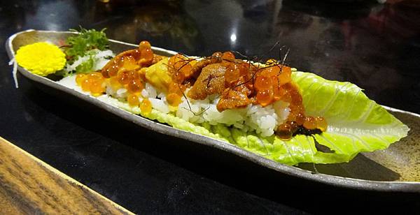 馬糞海膽蘿蔓捲:剛好有馬糞海膽雖然貴一點但當然要吃囉,因為馬糞海膽比起一般海膽鮮甜,味道更濃郁,口感更幼滑,還有鮭魚卵點綴,一入口就感受到滿滿的鮮美甘甜不自覺的嘴角上揚,吃美食就像泡溫泉般享受,身心靈都滿足了。